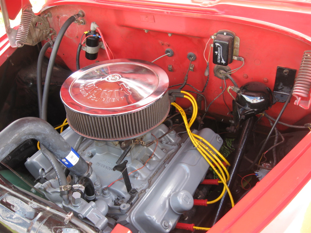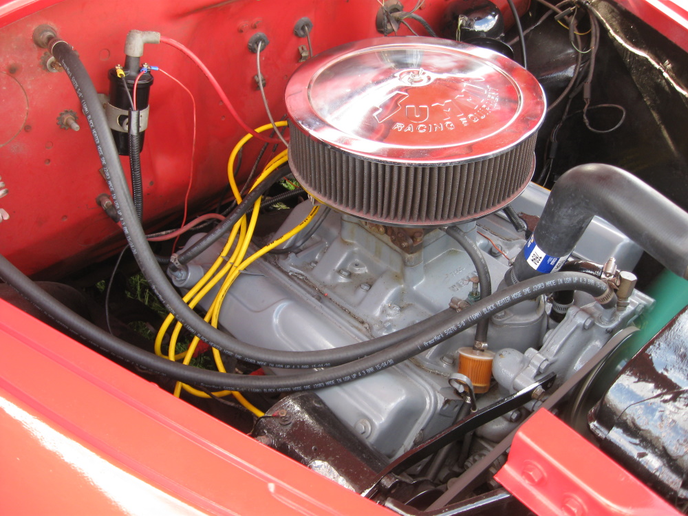 Engine: V8 with new plugs, wires, distributor, pertronix ignition. The carburetor has been rebuilt, and an electric fuel pump added. The initial start feels like the engine has exceptionally high compression, could be the starter getting tired?