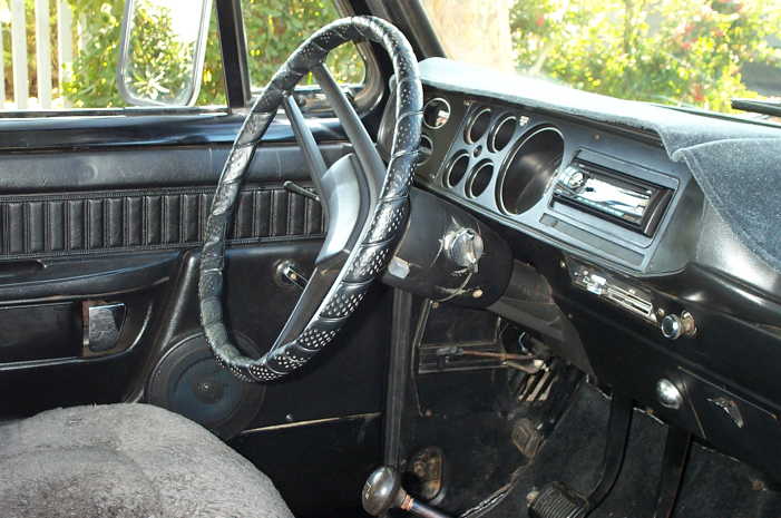 Originally equipped with a ragtop, the hardtop was added about five years ago. Most of Dave and Ellen's attention has been devoted to the interior, rebuilding rusted areas on the floorboard with metal and fiberglass, coating the floor and rear bed with rubberized bedliner, adding new carpets, seat covers, etc. They have added an Alpine CD player, repaired the heater controls and dash lights, replaced the door seals, and added the factory vacuum/volts gauge cluster to the left wing of the instrument panel. Most importantly, they found the missing "D" which allowed them to restore the "DODGE" lettering to the front of the hood.