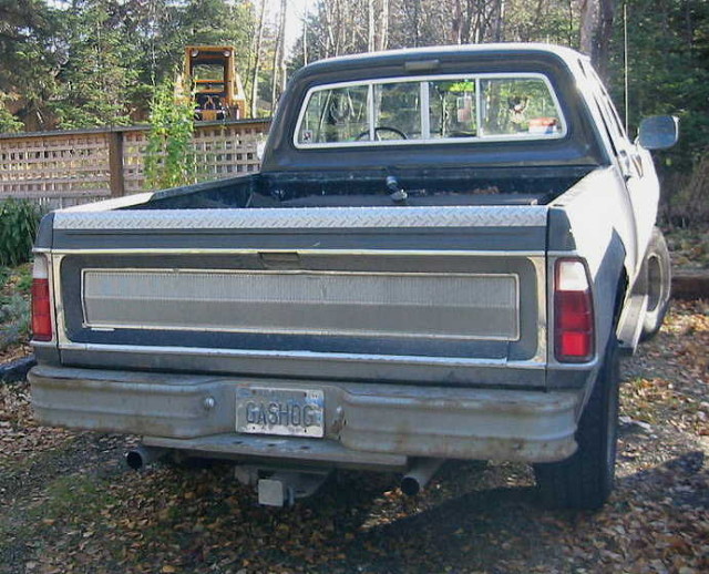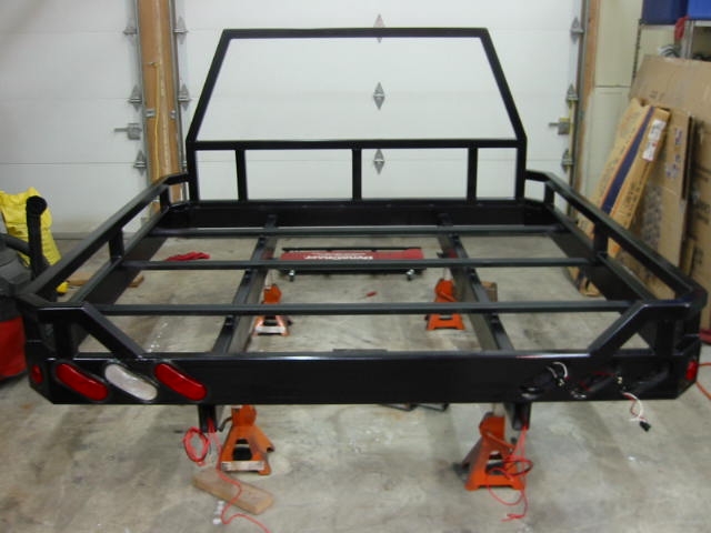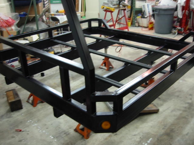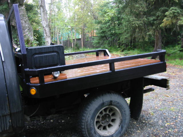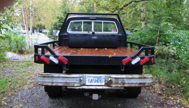 UPDATE: Below are pics of the flatbed Hal installed on his truck until he gets the body work done on the cab and bed, which he has started in the garage. If all goes well, he should have the truck back together by Fall 2007. Hal converted his truck to part time four wheel drive, changed the axles and transfer case so he can now select when he wants to be in four wheel drive.