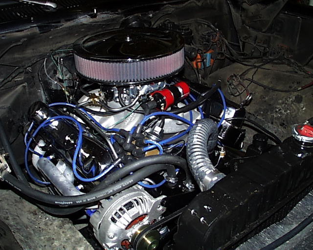 When this 80 D100 2WD Ram came into the family it had already been upgraded from a 6 cyl to a 318 4BBL. Chad felt it needed more torque to be up to the task of pulling his race car, so he built (with his dad footing the bill) a "mild" 440, .030+ TRW pistons with 9.43-1 compression, Performer RPM intake, 516 heads with 2.08-1.74 valves and mild bowl cleanup, comp 268-222 464" lift hydraulic cam, Holley Avenger 770 vac carb, and 1 3/4 Hedman headers, 2.5" Dynomax Hemi turbo mufflers, 727 trans, tight 11" dynamic converter with 1600-1800 stall. He has tinted the windows and done a brake job. Good brakes sound like a excellent idea since he ran 14.01 @ 98.3 the first time out. He is using a B&M truck mega shifter and has replaced the stock gauges with Summit white faced gauges. He gets around 15 mpg, which is great, considering the amount of power the truck makes. Nice truck Terry! Nice job Chad!