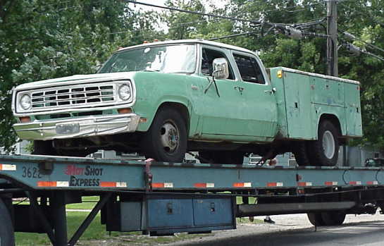 Cam's "Texas Cadillac" is a 1974 Dodge D300 crewcab - 360 NP 4 speed manual with no frills. He purchased it sight unseen from private owner in Georgia, except for small photo on Trucktrader web site (now Autotrader), in July 2000. He contracted with Hot Shot Express to bring the beast home. Plans were to strip it down, start over from scratch. Due to being "workforce reduction"ed out of employment in January 2001, it will become a daily driver for now. Hopefully one day it will be Cummins powered, Eaton AutoShift 6 speed trans, custom interior, exterior kept as original as possible, Dodge Brilliant Blue paint, Alcoa rims and aluminum flatbed for pulling 5th wheel trailer.
