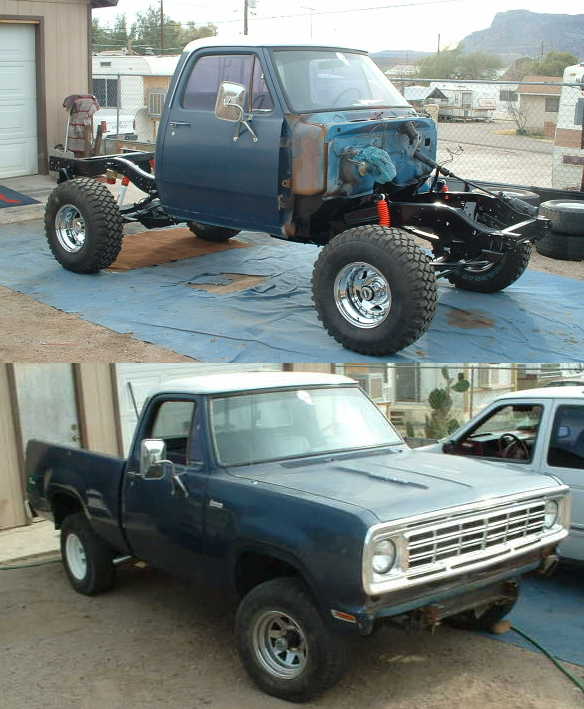 Bart started with a '76 W100, 318 stick full-time 4WD truck with a Chevy 6 lug Blazer axle under the front. The old axle was in the back, hubs were junk and the carrier was shot. Bart totally rebuilt the front axle with part-time knuckles and hubs, and installed a Trac-Loc carrier. He swapped rear axles to a 5 on 5 1/2 bolt pattern to match the front. He also installed rear Trac-Loc and a Rough Country 4" lift kit. He has totally rebuilt the bed, painted the frame and he is currently rebuilding a '78 440 for it. Once the cab is painted he will start on the wiring.