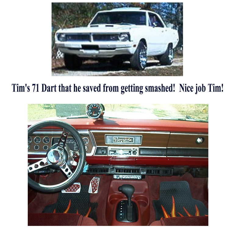 Tim has been a Mopar fan since the late 60's. His 2nd car was a 68 Belvedere and he has had about 20 different Mopars ever since, ranging from sport coups to pickups. This is his latest...a 78 Power Wagon 4x4. He found it at at wrecking yard, realized it had potential, so saved it from being smashed. He paid only $175. Three of the tires were flat and it had some minor dents on the drivers side, a little rust around the rear fender wells and some of the trim was missing. The rear bumper and tailgate were banged up pretty bad, and the motor didn't run but the tranny and transfer case turned out to be good. Tim stripped it down and cut the rust out and after many hours of body work it got it's primer. He pulled the heads and all looked good. It even had fresh antifreeze in it. So he bought a new set of gaskets, plugs, wires etc and put it back together. He removed the fuel line going to the carb and spun it over. It looked like chocolate milk then he pulled the carb. It was rusted inside the bowl so off came the tank and he replaced them both. He also added an electrical fuel pump. Tim put it all back together, fueled it up, turned it over and it fired right up...It's been running good ever since. One day Tim plans on putting a big block in it. Right now it has a 318. It's now painted and ready to drive. One added note...the original bench seat did not have a tear in it! If you would like to contact Tim about his Mopars please email him at: tshelton99@aol.com Also, here's the 71 Dart Tim saved from the wrecking yard.