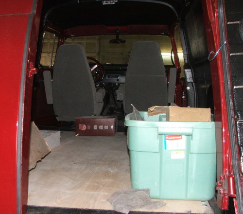 We now have the truck shown in the photos: a 1962 Dodge Town Panel Power Wagon with incorrect '300' emblems on the hood, although the axles and springs are certainly up to a 1-ton classification. For power, the truck has a rebuilt 383cid engine with headers and a 4-barrel Edlebrook carb and Edlebrook manifold. The truck's NP445 4-speed trans was provided by Joe Leonard; and it has a NP205 transfer case with two Dana 60's. We powder coated the after market bumpers and the headers, and installed a new heater, a 4-speaker Jensen 6-CD stereo, and two White Freightliner bucket seats. We replaced the cargo floor with a one-piece laminated oak deck, which I will stain and cover with 3/8 inches of clear polyurethane this spring. The mirrors were provided by John Geidl, and most of the rubber by Pat Walsh Restorations. We replaced both door latches with "Bearclaw" latches, and the seat belts are from an old airplane. The underside of the oak floor is painted with undercoating, and the entire interior is sprayed with bed liner material. The truck is completely utilitarian with no carpets, plush interior or the likes.