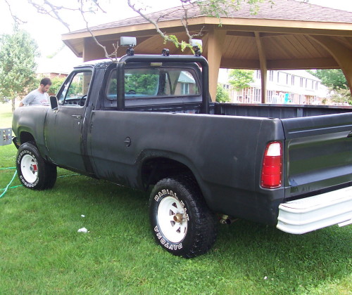 Mike is currently deployed to the Middle East. When Mike entered the service in 1990 his dad gave him this truck. It was brand new. He can remember seeing it at the car lot - brand new - bronze metal flake color. He is slowly trying to restore her and would like to see her back to her original bronze color. He has new rims for the truck but wants to wait to put them on until he gets new 33 inch tires. He would also like to put in Captain's chairs. The truck has a 360 engine in it right now. It's not the original. His sister ran the original engine out of oil and blew it up. The engine that is in it now has had the heads re-done and a new two barrel carb put on it. It starts right up every time and has the power to squeal the tires - something every Mopar enthusiust loves to do. Mike has all the repair panels for around the back wheels, rocker panels, and behind the front wheels, but hasn't had the time or money to have them installed. He hopes to give it to his son Zacherry some day. His son loves the truck and calls it "The Beast". Zacherry is always with his dad helping with the repairs. Sounds like we have another Mopar fan!