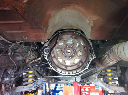 5. Rear trans mount will need to be re-drilled on the frame rail 1" inch further back to allow for the 1" longer engine trans adapter plate, which was also the reason for the shorter front section of the drive shaft.