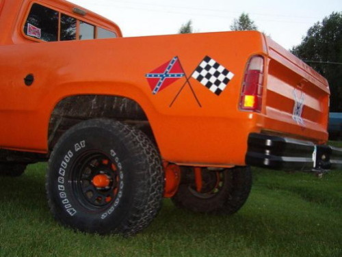 The ignition has been swapped for an aftermarket electronic pointsless ignition and distributor. He added several custom graphics to bring out the "General Lee feel". He also added a 12 note Dixie horn, dual steering dampener and new shocks all around that have all been painted to match the truck (as have the brake calipers and the rear drums.