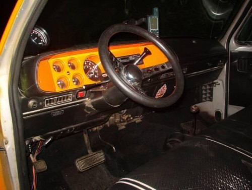 Chad stripped all the paint and repainted it using -- Rust-Oleum! He did this because it was fairly cheap paint and the truck was really meant as a joke. The primer was also Rust-Oleum brand primer. Chad redid the interior with new carpets and some paint and sound deadening materials.