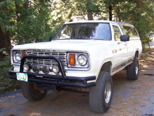 Rick's 1978 3/4 ton Dodge truck has a 6" lift and 35" tires. Rick has had his truck for a year and is now trying to get it legal for the road (Oregon registration). It has a 1987 front end with disk brakes, a 360 4 barrel and dual 3" Flowmaster exhaust. He says it sounds great! Rick added the shell and new fog lights. Because it sat so long, he also put in a new battery, rebuilt the carb, and gave it a full tune up. His truck needs some TLC but the body is pretty straight (1 ding in driver's door). It has Smitty Built "rhino guards" front and back. He still needs to get the front end looked at, transmission serviced and replace the choke spring. but feels after that is all done, it will be able to climb a telephone pole! We would love to see a picture of that!
