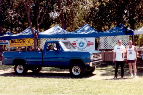 "ItsBIG" replaces the 1975 Viper Blue Power Wagon we built that took second place in the 1997 Capital City Mopars "Day In The Park" car show. Our Power Wagon has a 440 with an Edelbrock aluminum intake and Edelbrock carburetor, RV Cam, forged pistons and it was balanced before assembly. The front differential is a Dana 60 with 3.73 gears and the rear differential is an HD Dana 60 trak-lock. We had the stock tachometer and vacuum and volts gauges installed and the seat was reupholstered in black naugahyde. It has been a great truck. We towed a 21' travel trailer 150 miles into Baja with it, but we think we will like our new roomy Mega cab even better for towing.