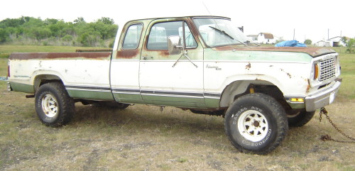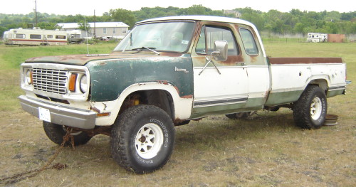 Kelly bought this 1978 Club Cab Power Wagon about a month ago for $500. It has a 318 in it that supposedly runs. He doesn't know for sure yet, since he is on a contract in Afghanistan, and not scheduled to go on R&R until September. Kelly plans on turning his truck into a complete custom truck, (there won't be much stock left on it). Kelly's 12 year old son has already laid claims to it, so he is kinda shootin to have it finished by his son's 16th birthday.