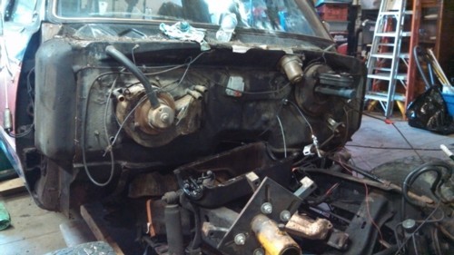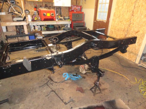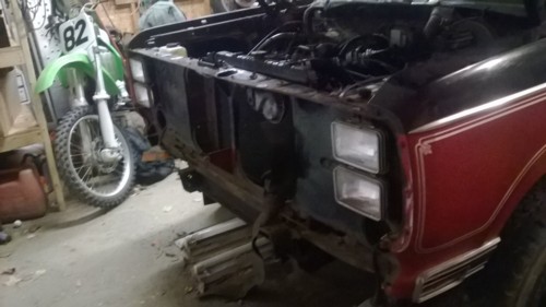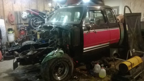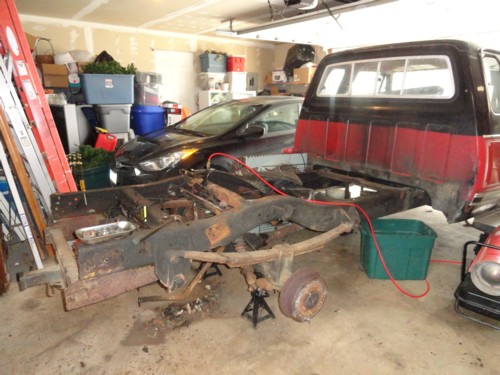 UPDATE February 2014: Darren is 17 now, and has been working on the truck for over a year. The bed rusted completely out, so he picked one up from Arizona. Darren pulled the bed off, stripped the frame down and painted everything and replaced all lines, bolts, rubber pieces etc. He went through the rear end and put new brakes on then put the back half back together and now he is doing the same to the front. He is in the process of pulling the cab off right now. Darren plans have changed since he first emailed us. Now he plans on just running 3/4 ton springs and maybe slightly bigger tires. He also plans to swap in a mild build 360 magnum. Below are some updated pictures: