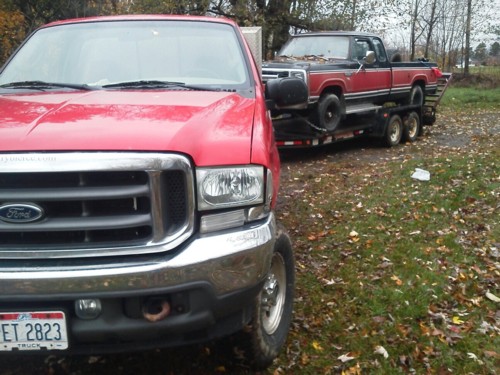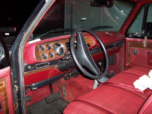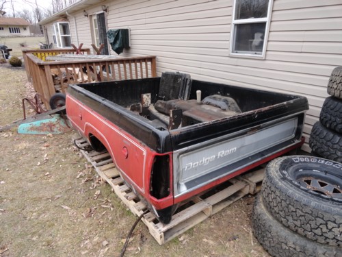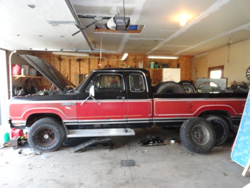 It has a 360 V8 in it, but after Darren gets it he plans to put a Hemi in it. He also plans to raise the truck about 4 inches and put some Swampers on it. Right now it is in pretty bad shape, all the floor pans are rusted out and it isn't running very well.