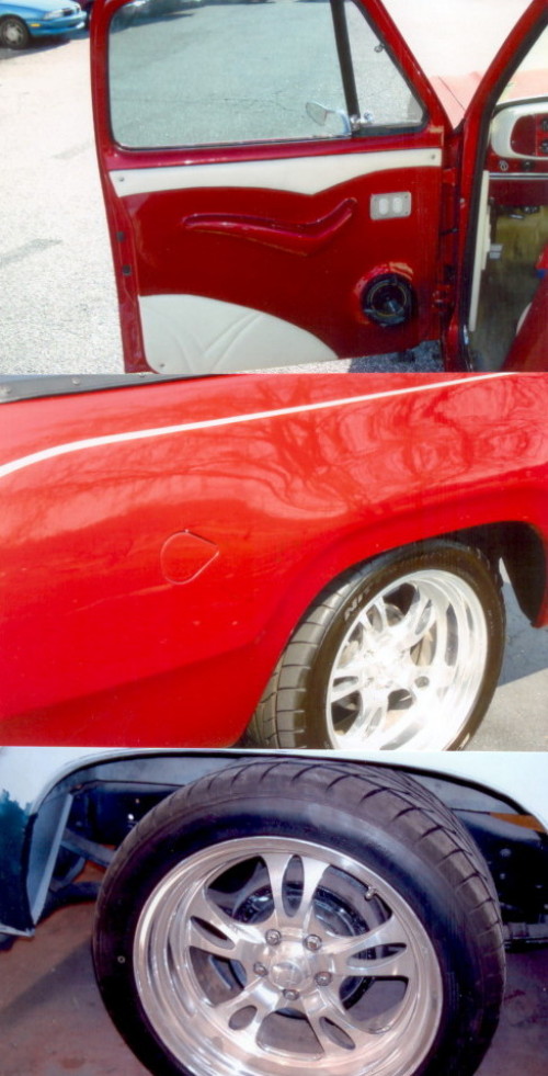 John and Deborah's truck is now painted a 2002 Chrysler color (Salsa Red Pearlcoat) with the V graphic in Khaki Tan with a shadowed effect and the body is pinstriped lightly by hand in black. In keeping with the paint scheme, they made stencils of all the exterior emblems and airbrushed them into the paint and John designed his own emblem for the tailgate. They have added Billet oblique hot rod mirrors, new halogen headlights and 60 inches of fully functioning LED tail lights between the tailgate and the roll pan. The tires are Nitto P245/45ZR 17's front and 275/40ZR 18's rear.