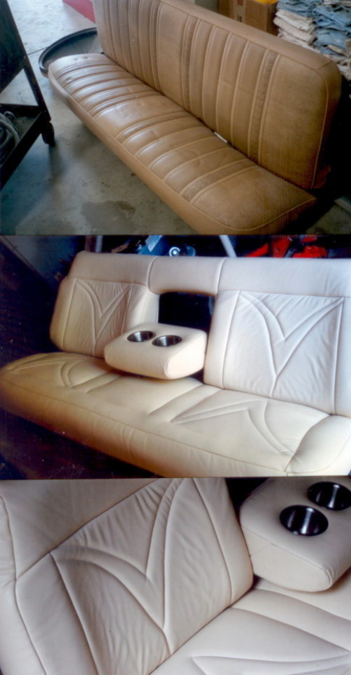 The interior of the truck has been color matched to the exterior. The bench seat and door panels have been played off of a V graphic on the exterior. The seat is from a 1994 Ford and it has a fold down arm rest in the middle with cup holders. Since their truck was radio delete they added a custom sound system which includes a Pioneer head unit; 2 Kicker amps, 2 Kicker 12" subs in a custom box, 4-6" mids and highs and 2 tweeters in the dash. They also added remote door poppers, power windows with tint, a polished Billet steering wheel, polished Billet pedals and a khaki tan headliner.