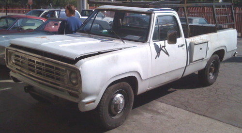 Frank Gregory lives in Hollywood, CA. He bought this 318 4 speed stick shift D200 about 9 months ago, mainly for nostaligia reasons, because he used to own a 1990 V6 auto Ram in New York. This one was basically mechanically sound, but missing most of its dash, and the body and bed were very beat up.