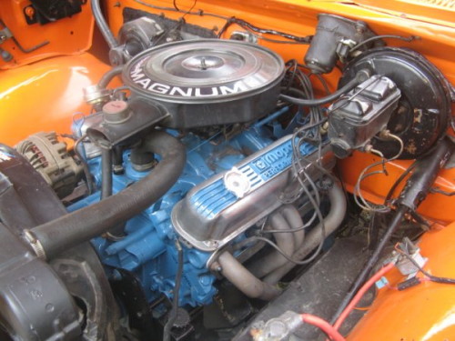 A machine shop in Ohio rebuilt a nice 360 Piper bought. They supplied them with two ported and polished 010. milled heads with 4 angle valve job, new bronze valve guides 202int and 160exh stainless steel valves with the best springs they could find. Piper's machine guy suggested staying with the dished pistons (89 block), so they could still run pump gas. The shop supplied the best bearings and chrome moly rings. They got a purpleshaft 480lift 280 duration cam, Edelbrock Performer intake, a Carter thermoquad carb along with a set of Hooker competition headers and purple Hornys which are too loud for Piper. The rear they bought couldn't take the punishment and snapped. His son Ronald installed his version of a Detroit Locker. He welded it solid (turns are not good, of course). Straight down the road, they haven't lost a race yet. Above 6500 rpm, the engine really really turns it on. It is very scarey fast, which is exactly what they wanted. Ronald tells people here it makes 650 horsepower. We had it dyno'd at the college here. Piper was impressed, at 6800 rpm it put out 504 HP.