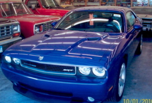2010 Challenger, Plum Crazy Pearl coat. Bought it March 15, 2010 in Lincoln, Nebraska. Drove it off the show room floor, trailered it home, backed it off the trailer into this spot. It has only 2 miles on it.