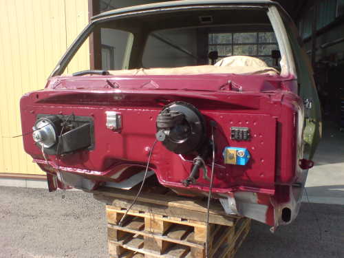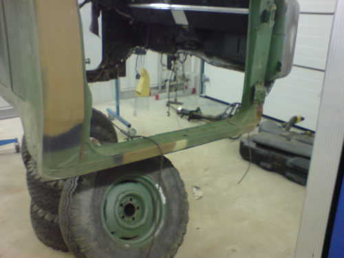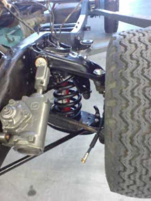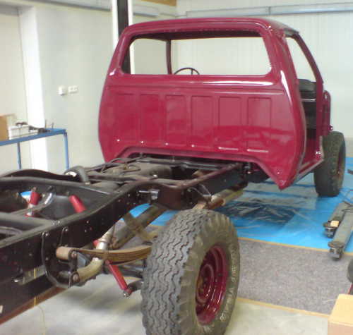 Mario worked for 3 days with Markus' employee to get all the rust off the frame. The frame was then treated with rust converter, primed with Army chrome oxide primer, the imperfections filled with body filler, then painted black. Many of the components were replaced: ball joints, tie rods, brakes, lines, hoses, fuel tank, springs, shocks, steering gear, and anything else that was worn out.