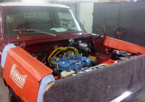 They converted Mario's truck to a 318 with 10.5:1 forged pistons and a medium hot camshaft, but kept a 2BBL carburator for fuel mileage. They also installed a true dual exhaust system. They had the truck inspected and approved for the louder exhaust, the hitch, and the change in displacement. After everything was approved, they installed a fire truck horn (not legal!)