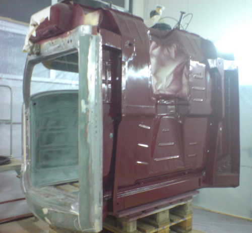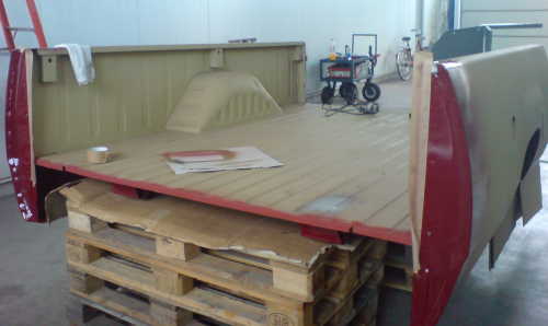 Working together they replaced the cab floor with a used one they had reworked. It took them 10 days to do the bodywork on the bed. They worked on the A Pillars, doors, inner feners, fenders, everything was cut and good metal welded in. Markus painted the "inside surfaces" and they hired a pro to shoot the exterior.