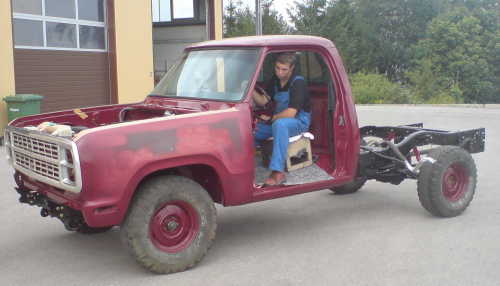 Mario's truck started from the leftovers of another truck project in 2007. Markus (Mario's Step-Dad) told Mario that they could build a complete truck from parts left over from other projects. Mario's Dad asked him, "What do you want with that rusting crap?" When Mario decided he wanted to work with Markus building a truck, he was 15 and the plan was to build the truck and have it road ready when Mario turned 18 and could get his license. This plan failed for 2 reasons: