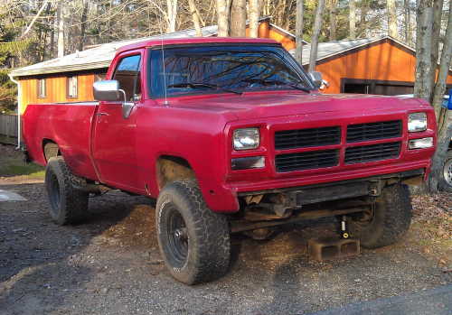 Dylan owns a 1991 Dodge W150 with the 318 topped with a Holley two barrel carb. His truck has a 4 speed standard transmission but Dylan plans to put a 5 speed in it. The truck is lifted 4 inches with 33 inch all terrain tires. According to Dylan, "She's good on gas and she's fun in the mud."