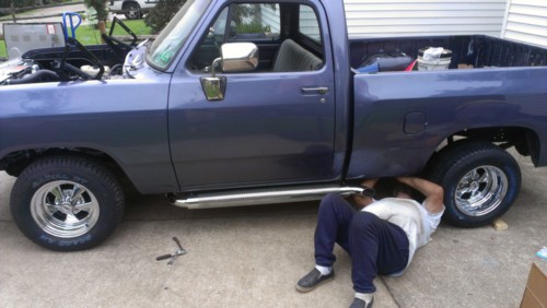 Trevor just bought this 1988 318 Dodge Ram 150. It has the factory computer, fuel injection, and all of the smog on it. That will come off and it will be replaced with an aluminum intake manifold, Carter AFB, and an MSD electronic ignition box. Trevor plans to paint the engine bay black and the motor dark gray. He will equip it with long tube headers, a dual exhaust system with 2.5 pipes leading to Flowmaster 40 series mufflers exiting right in front of the rear tires. Trevor plans on wider back tires with beauty rings for the black steel wheels and he will lower the rear about an inch. Other plans are to have window tint, mild cam, and a roll in bed liner. He wants it to be a show truck with a stealthy, clean look.