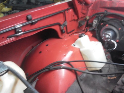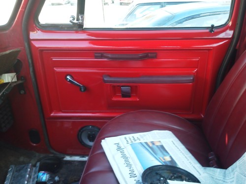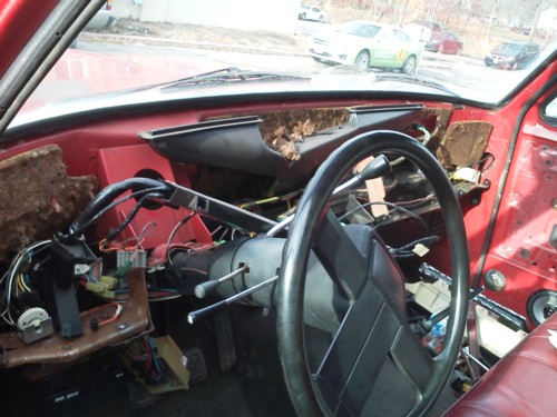 Cody is currently redoing the interior. He has reshaped and smoothed the dash and doorpanels and he is bedlining the floor. There is new wiring throughout the truck, plus he has changed all the dash lights to red and warning lights are white. He took out the cargo light and made my own with switches. He is using the factory radio but needs a place to plug in his iPod and phone. He plans to diamond plate the bottom of the doors and the kick panels and hand fabricate a piece to go around the 4x4 shifter.