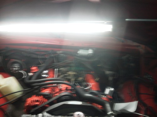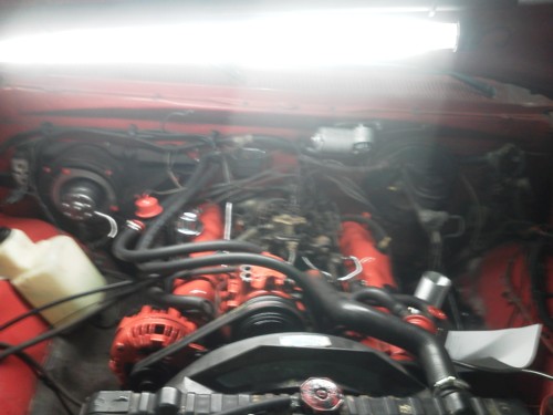 Cody has redone the motor. He wants to send special thanks to Ronnie at A&R for telling him about the water pump having a plastic gear and the need to replace it. Cody got a red top Optima battery to go with the red theme. Everything under the hood is either painted or polished. It's all original and so is the paint on the outside. Cody painted the grill black, smoked all the lights except the headlights.