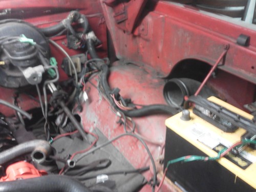 The truck was bought with 36003 miles on it and now has 36010. Cody has sanded and undercoated it and also fixed a hole in the frame and boxed in the bed back for support. He put a Super 44 with a 3 inch pipe on her and removed the catalytic converter.