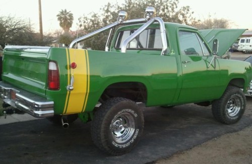 John bought his 1978 Power Wagon 3 years ago and started the rebuild project shortly afterward. John gave it a HI-Pro 318 with a rebuilt 727 transmission. He put in a NP208 transfer case from a 1985 Ramcharger. He also put installed a front Dana 44 with a Detroit locker and a 9.25 3.55 gear with a Detroit locker in the rear. He added a small lift and 33/12.50/15 Mickey Thompson tires. John painted it John Deere green with a yellow John Deere stripes in the back.