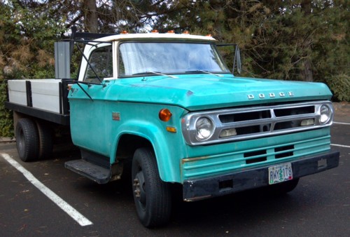 Gonzzo's 1970 Dodge truck is a Stake Model with a new flat bed. It has 10,000LB GVW and a 4700LB payload capacity. It has the original 318 with a 727 torque flight. The truck runs great with only 78000 on the odometer. Gonzzo believes it's original mileage. Somewhere along the line it was repainted the original Desert Sage color. At one point, his truck had a sign and phone number on the doors, but it's long been too faded to read - darn! The patina on this truck is great. Get behind the wheel and throw on a straw hat and it's a time machine to 1970. It has a 159 inch wheelbase. The side marker lights for it are not correct and will be coming off at some point. Gonzzo also has a bed mount crane for it (not pictured). This is a real heavy hauler, but drives like a cream puff.