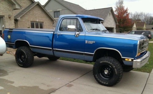 Bruce owns this 1988 Power Ram 250 with a fresh high output 360 and 727 transmission. The body is rust free with all original light blue factory paint, with the the exception of the dark blue two tone paint, which was added later to the tailgate and sides. It was originally a Florida truck. Bruce rescued his truck from a guy who was using it to run sand drags at Silver Lake, MI. He says this Dodge is as clean underneath as it is on top.