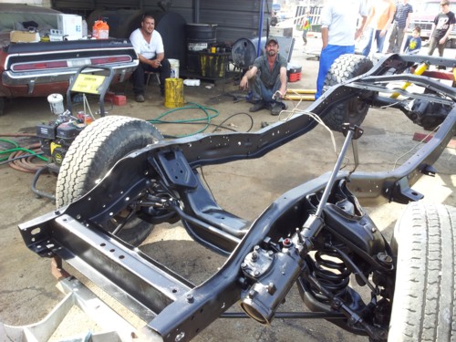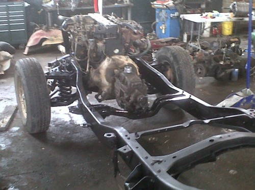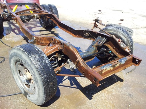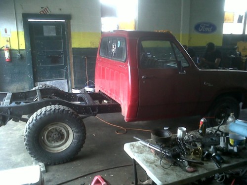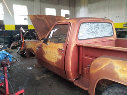 Thompson bought his 1978 Stepside for $500 and drug it to the shop. His friend who runs the shop found a 1993 3/4 ton Dodge truck with a 12 valve Cummins in it for $2500. They put the Dana 60 rear end and the 3/4 ton front suspension and steering on the 78 frame and used the 93 cab and front support. Thompson is getting it ready to paint and will keep us updated on his progress.