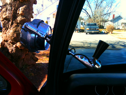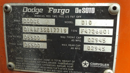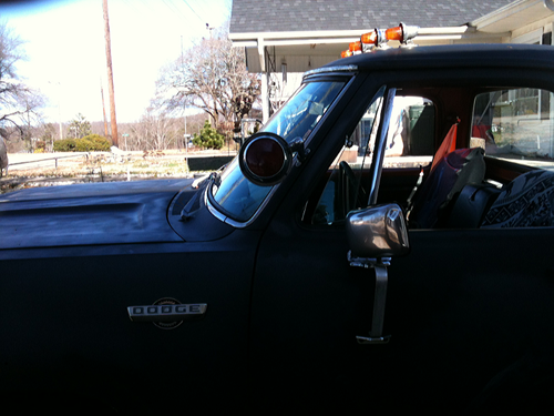 Some of the things Ira did were to add a 1973 340 intake, headers, Holley fuel pump, deleted the non-working ac by adding an idler pulley from Tractor Supply and using a longer belt, Moog coil springs, new brakes, repaired most of the wiring, and shop vac'ed out the mouse nests. A few things he added for style are clearance lights from various Internationals, utility light from a late 60's Ford fire truck, 1940's hood Ram from a Dodge car, fender emblems from a 60's Dodge 800 series (interesting note: on the back of the emblems you can see the word diesel cast backwards, but not on the front). Ira also added round quarter panel lights from a 1965 Chrysler New Yorker.