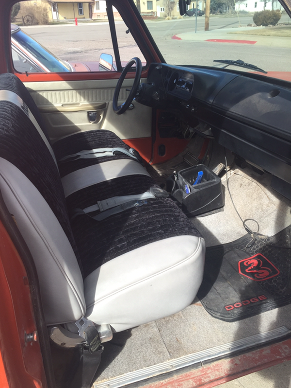 Calvin bought this 76 D100 3 months ago. It started life as a slant 6 727 and 9 1/4 rear. When he bought it, it had a fresh 318 in it. Since then, Calvin had a sure grip installed, and he is currently plumbing a fuel cell in. This summer it will receive a fresh 440/727 that should have 450-500HP. The long term goal is to build a 1990's 360 magnum with a 518 overdrive trans, and have a street strip truck.