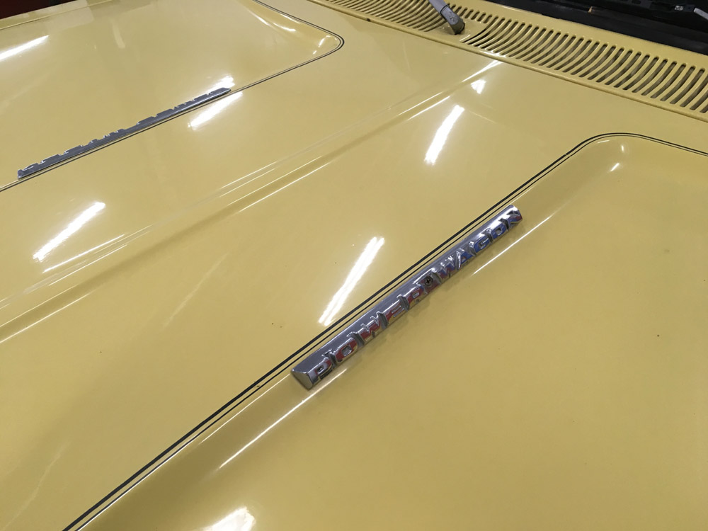 UPDATE (April 2018): Below is the latest picture with the pinstripe removed and the "DODGE" letters put back on the hood.