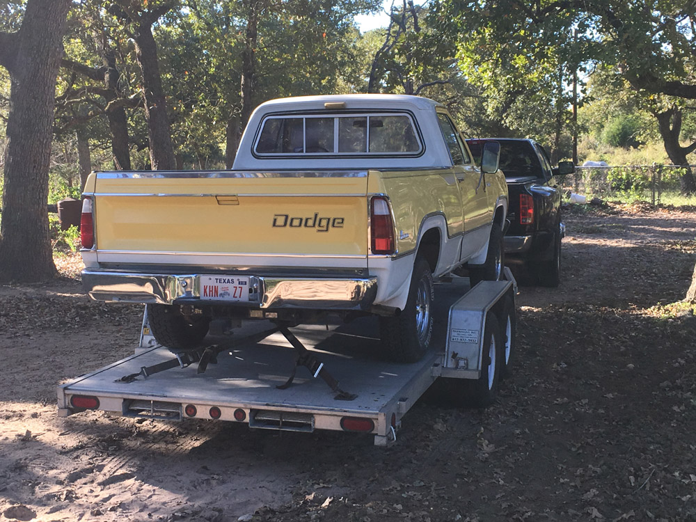 The seller agreed to hold the truck for Eric, while Eric arranged the trip South. Eric talked his friend Joe into traveling with him, with his trailer in tow. Starting at 4AM, they drove 18 hours straight, and got to within 30 miles of the town in TX where the truck was at, and spent the night. They got up the next morning, and went to see the truck. Their GPS guided them way out into farm country, and back into the woods. They were getting concerned, because they were carrying cash, and it looked like they were heading into nowhere. Eric and Joe finally found the seller's place, and he had them pull the truck and trailer into his fenced yard, and up to the garage area. He opened the garage, and DROVE the truck out. It didn't take Eric more than a 5 minute walk around, to know he was buying the truck! He took the truck for a short drive, and made the deal. They loaded the Power Wagon onto the trailer, and started back North.