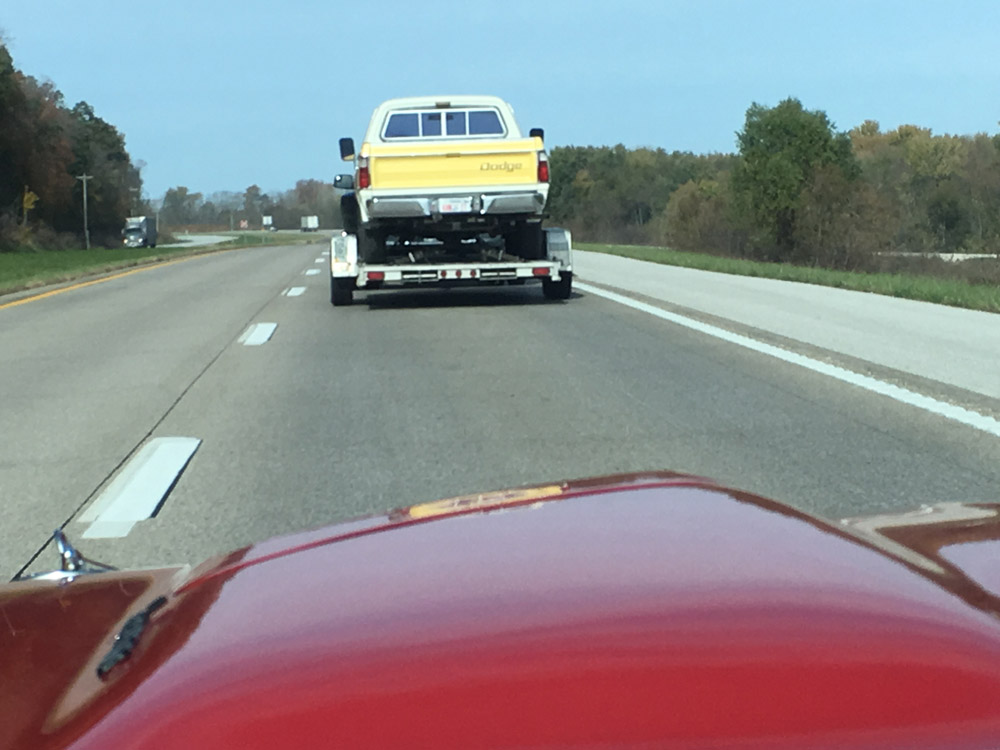 Attached are pictures of his truck from the trip to Texas to pick it up, and a view of the truck from the seat of the Cuda, following it home. There are also a good before and after picture of the front of the truck. Eric will get some more pictures of his truck in the shop, once he moves things around. Eric is working on a '69 440 Dart GTS, a '69 440-6 bbl Road Runner, the '70 Cuda, and the Power Wagon right now. He also has a '89 Shelby Dakota as well as a few more cars and motorcycles. He has plenty of projects to keep him busy!