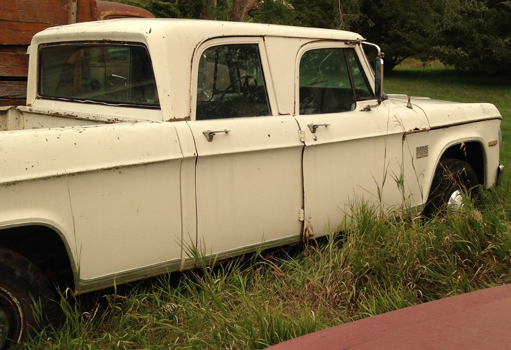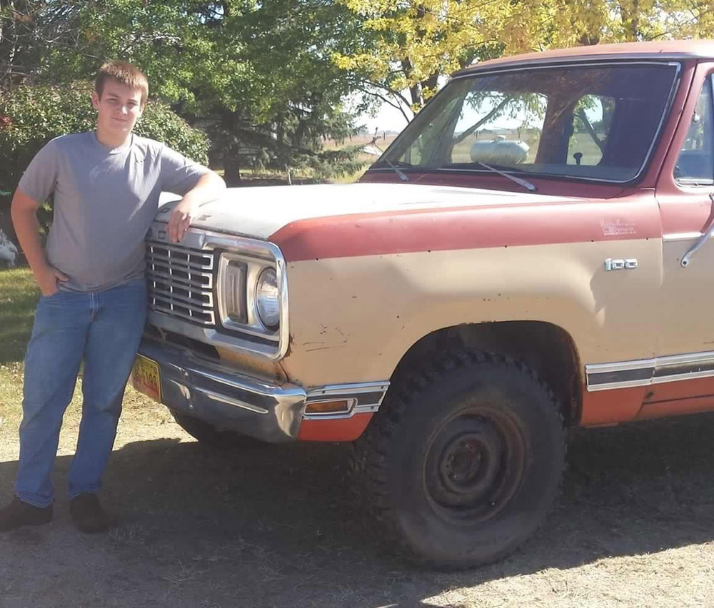 Tyler's 1970 Dodge D200 Crew Cab has factory A/C. Tyler's Great-Grandpa told him it either has a 383 or a 413 in it. His Grandpa bought it from a guy in Iowa, who used the truck to tow his pulling tractors around. He swapped a motor from a 1963 Dodge Dart into it. Tyler plans on buffing out the paint, putting new spider gears in the rear differential, dropping the tranny and the replacing seals, and then driving it for awhile. He would like to do a Cummins swap into it some day.