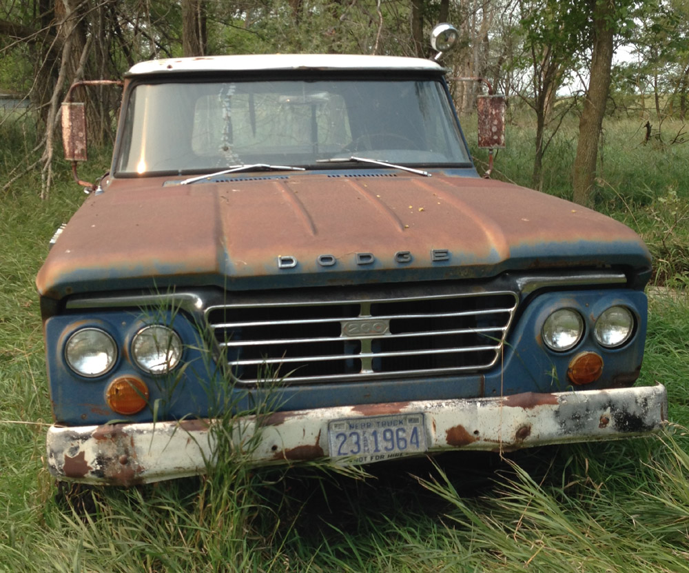 The 1964 Dodge W200 was Tyler's Grandpa's first truck that he gave Tyler. It has a 318 poly, 3 on the tree. Tyler is planning on getting it running soon. It has a dealer installed spotlight. Tyler's Grandpa knew the original owners, who used it as a construction worksite truck.