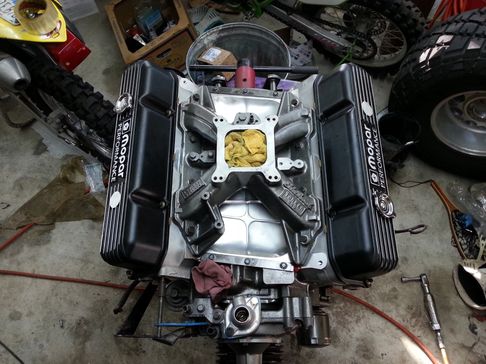 Rebuild 440 with Keith black forged pistons, Comp Cams Roller Cam and Roller Lifters, Harland Sharp Roller Rockers , 440 Source aluminum heads, MSD Ignition, and Quick Fuel off road carb (Dyno 570 hp )