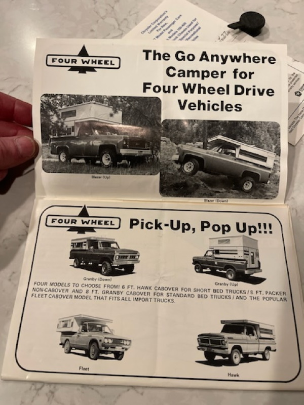 Four Wheel Camper was started in Denver, CO in 1972. Scott was able to reach out and chat with the son of the guy who started the company, and inquire about his particular setup. He informed Scott that they did not offer a dealer program, and each camper was custom built per individual owner's order. When he saw Scott's original documents, he informed Scott that while they built a great number of Bronco and Blazer campers, they did not do many Dodge or Plymouth units, and that the original owner of Scott's truck would have to had to go to them prior to purchasing the truck, to spec out the camper and have it built in time to have it installed once he purchased the new truck. Four Wheel Camper did not pre-build campers and have them in inventory ahead of time. He mentioned the fact that most campers sold went to owners who had already owned the vehicle for a period of time. Since the one on Scott's truck has been on there since the truck was delivered new, it may be a one of a kind.