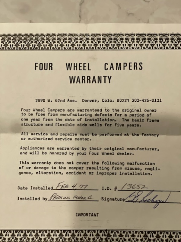 Scott purchased his Trailduster nearly a year ago from the estate of the original owner, in Colorado Springs, CO. As luck would have it, the original owner had saved many of the original documents. This Trailduster was sold new at Perkins Motor Co in Colorado Springs, on Jan 21, 1977. It was delivered on February 4,1977. After the initial purchase in January, the owner had the dealer drive the truck up to Denver to have a custom Four Wheel Camper installed. He then took delivery of the truck on Feb 4th with the camper on it.