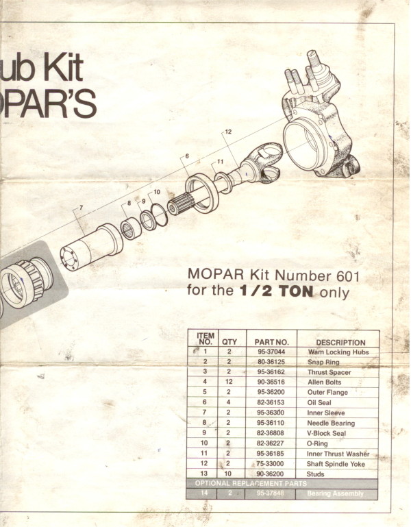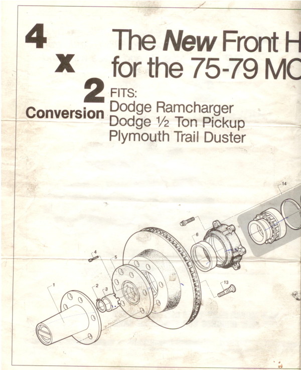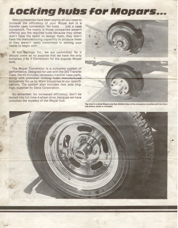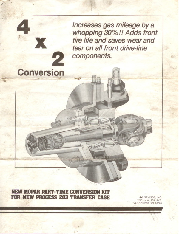 This infomation is a scan of the 4x2 Savings Inc. "New Mopar Part-Time Conversion Kit for New Process 203 Transfer Case". The locking hub mechanism is similar to the Ford Bronco II but the axle shaft diameter is bigger.