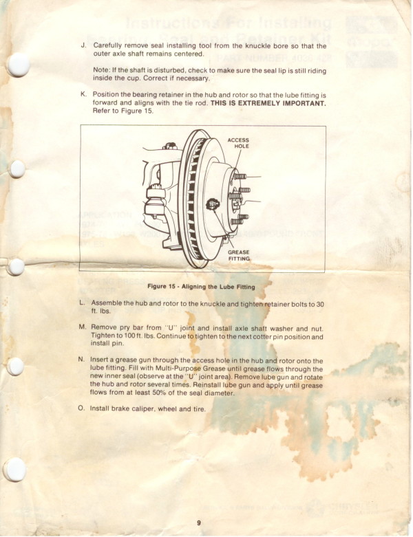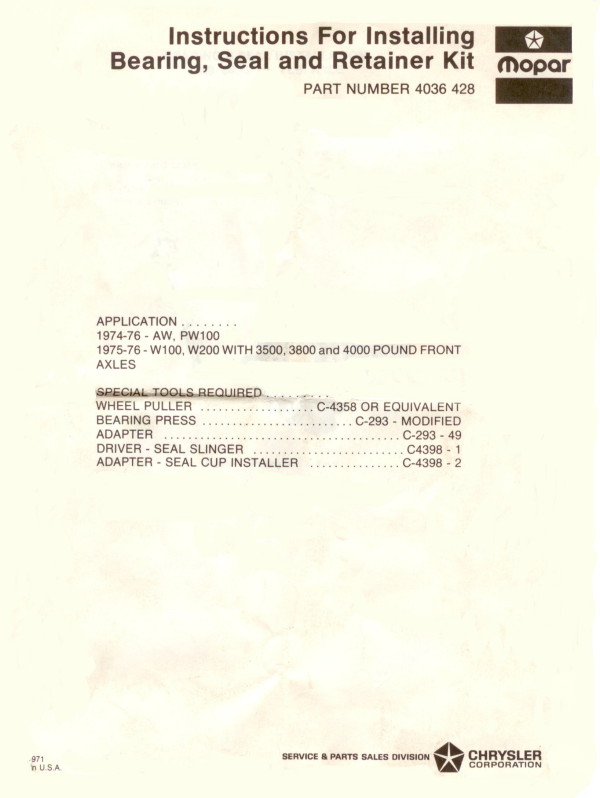 This information is a scan of the Chrysler Corporation "Instructions for Installing Bearing, Seal and Retainer Kit" Document number 81-685-1971.